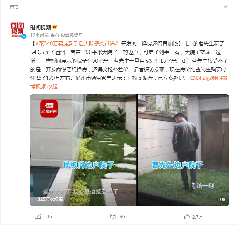 近日,据北京时间旗下时间视频报道,北京的曹先生花了540万买了通州一套带“50平米大院子”的边户,可房子到手一看,大院子变成“过道”。